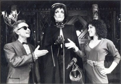 At one Saturday matinee performance we really hit rock bottom. The director had called an early “note” session before the show, so there had been no time to put on my complete makeup. My wig had just been washed, and it was a mess. The sound of the rain in the first act was so loud we had to scream out all our lines again. The audience also was very strange. I imagined Rieka Kanter Fisher herself had personally bused in all the schizophrenics from mental hospitals around the city. They fought loudly over their seats after the curtain had gone up, they yelled to each other from different sections of the theater, there was a terrible odor emanating from somewhere in the orchestra, and the show never got a laugh, except once: when the actor wearing the moose head got socked in the groin.